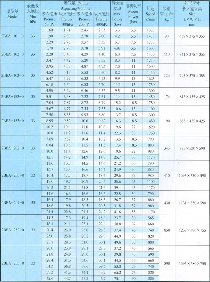 注:以上所選電機功率可在大多工況下工作。如排氣口壓力較高(0.02~0.05MPa),則應相應加大電機功率;如2BE1真空泵正工作時軸功率較小,也可選用接近軸功率的電機功率,如此更為節能。